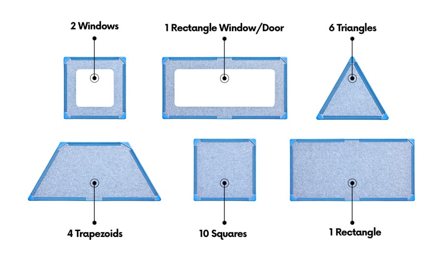 All of the panels are 9mm in thickness. The sides of the squares, squares with windows, and triangles are 500mm (20 inches). The long side of the Trapezoid and Rectangle is 1000mm (40 inches).