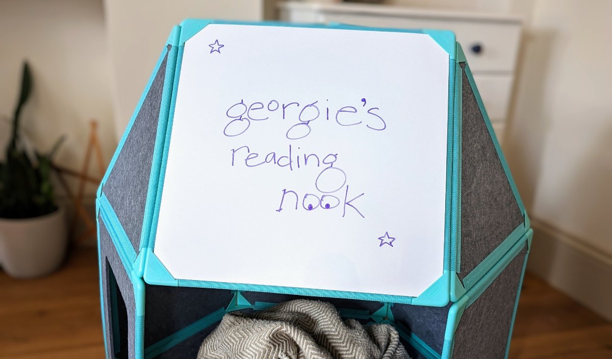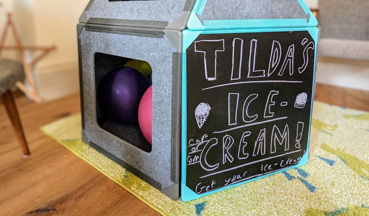A whiteboard on one side, blackboard on other - they simply slip under the corner clips of the square panels so kids can customize builds and further power pretend play. A menu board for a cafe, sign for a reading nook, or simply something to write and draw on for a vertical learning wall.